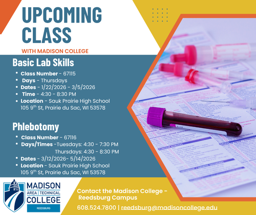 Start your healthcare journey close to home! Madison College is offering a combined Basic Lab Skills + Phlebotomy course at Sauk Prairie High School this spring. Both sections are required and taken together as one complete course.
